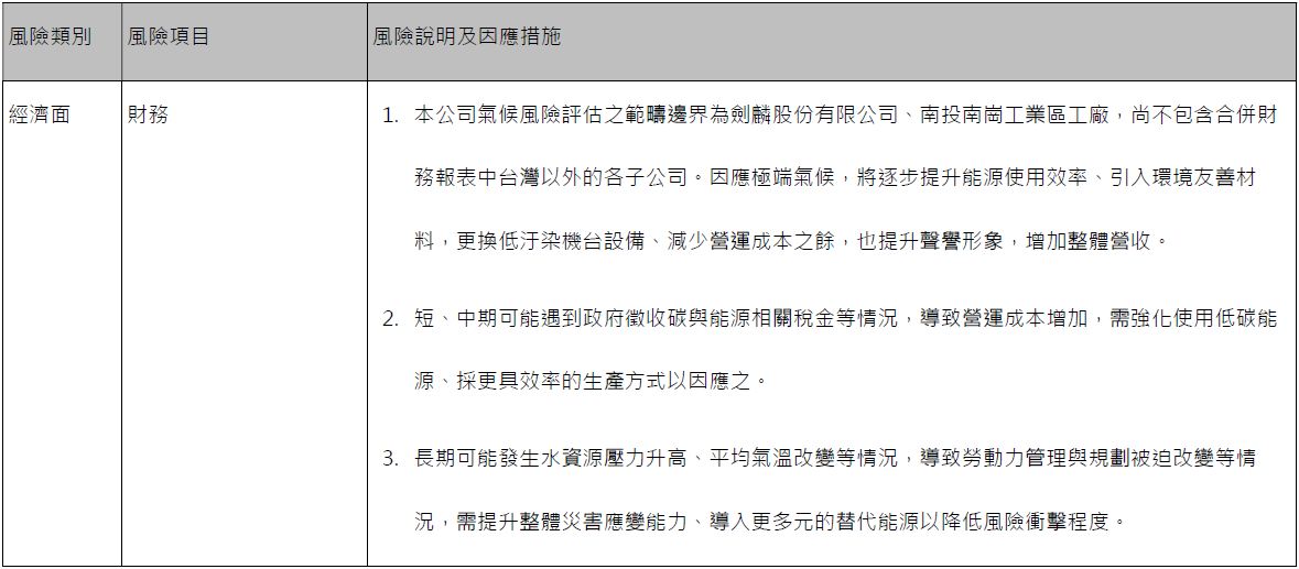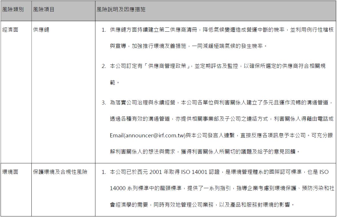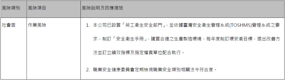 - 本公司就企業社會責任重大性原則,進行重要議題之相關風險評估,本公司的風險管理包括「作業風險」、「人力成本風險」、「財務風險」、「供應鏈風險」及「保護環境及合規性風險」等之管理,相關風險管理策略如下: