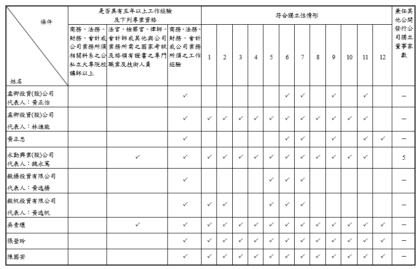 以策略目標管理方式管理集團內所有公司,本著「超越群倫、精益求精,品質至上、研發創新」的立業宗旨,追求「在健全的環境下永續經營,共同成長創造利潤」的最終使命。 魏永篤董事曾任勤業眾信會計師事務所總裁,關於公司財務報告,新事業之投資規劃,提出專業且全面性之建議,協助經營團隊提昇公司營運計畫更具全面化及完整性。 林進能董事 歷任子公司之總經理,且具備產業、行銷及管理之相關工作經驗,對產業及公司之掌握均極為完整,具領導決策、經營管理、風險管理、資訊科技、之相關能力。對於公司新產品設計規劃及促進公司生產流程智能化,提出專業之見解與建議。 黃逸揚董事 歷任本公司之高階經理人,具有產業、行銷、管理及公司業務所須之相關工作經驗,具備領導決策、經營管理、風險管理能力等相關能力。 黃逸帆董事 具備優秀之學術背景及相關產業實務經驗,對於公司新產品設計規劃,提出專業之見解與建議。 吳素環獨立董事具備會計師執照,且執業多年,熟稔政府法令及產業實務運作,致力於協助公司確實遵循法令規範。 張瑩玲董事 歷任本公司之高階經理人及董事,具有產業及管理等超過 30 年之工作經驗,具領導決策、經營管理、風險管理之相關能力,可提升董事會及各功能性委員會監督功能。 陳國安董事 具有金融、風險及管理等相關工作經驗,具領導決策、經營管理、風險管理之相關能力,可提升董事會品質及各功能性委員會監督功能。