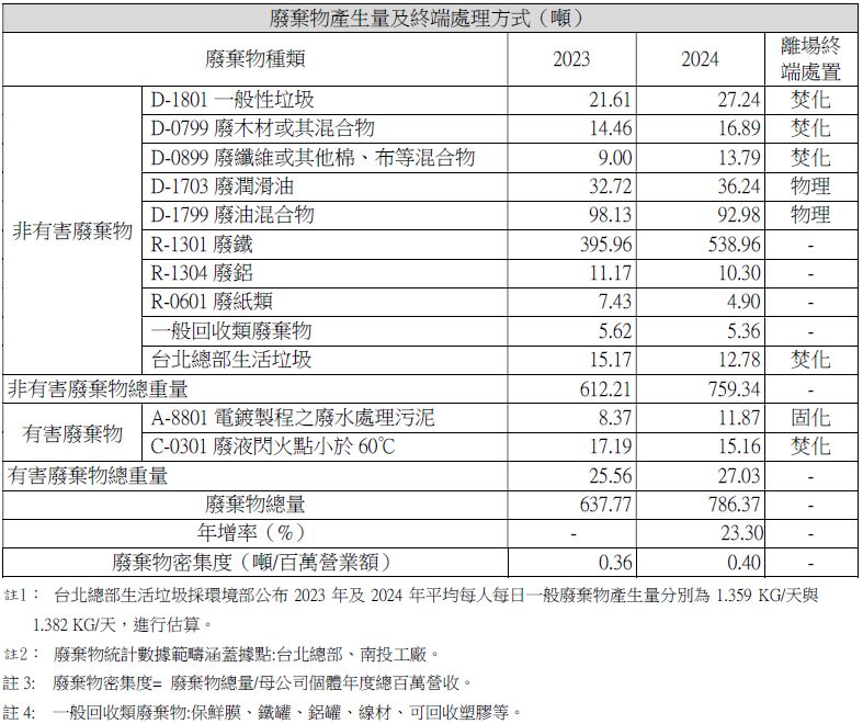 2023年台灣母公司已完成取得ISO 14064-1溫室氣體盤查並通過第三方查證:  2024年台灣母公司之台北與南投廠區溫室氣體總排放總量為23,243.78噸CO2e,直接溫室氣體排放量(類別1)總量為85.9715公噸CO2e;類別2 溫室氣體排放量為4,946.8007公噸CO2e;類別3 ~ 6 溫室氣體排放量為18,211.0074公噸CO2e。 <化學品及油品管理>近年國際各大品牌商對於產品有害物質與限制物質之要求趨於嚴格。劍麟所使用之氧氣、氬氣鋼瓶、防銹劑、清洗劑、調漆劑、潤滑油、廢水處理廠藥劑、高壓氣瓶及氣體發生器模組及危害性化學品…等之合規性已成企業不可忽視之規範。 劍麟重視產品對下游廠商可能造成之潛在風險,因此致力於配合客戶要求,符合有害物質之限制與規範,並制定危害物管制程序,且嚴格執行並實施,全產品無使用法規禁用之所有有害物質。2024年,劍麟未發生任何違反產品和服務健康安全相關法規,未來將繼續保持優良紀錄。 <空氣污染防治管理>劍麟公司針對空氣污染防制一切依政府環保法規規範執行,符合空氣污染防制法之排放標準,以避免廠區及周圍環境遭受污染,並維護員工與附近民眾健康。為此公司內部訂有「空污管制程序」針對各類型的排放源皆有對應之規範,包含每天檢查操作及防制之設備、依固定污染源及燃料操作許可證規範執行,各類型空氣污染物將透過集塵、洗滌塔等空污防制設備,再經由管道排放至大氣中。2024年度本公司空氣汙染檢測結果皆符合法規標準,未來將持續依照法規標準進行防制作業與合法排放,以維護員工及周遭社區民眾健康。 <噪音管制>訂定「噪音管制程序」,依勞工安全衛生法及噪音管制法之規定,劃分為作業場所及廠區周界環境兩類,並依規定時間委託合格檢測公司進行檢測,檢測結果需經管理代表確認,公告所有同仁周知後由行政單位保存之。 <廢棄物管理制度>劍麟公司主要產出之廢棄物可以分為:1.製程廢棄物、2.包材廢棄物、3.生活廢棄物。為此,本公司訂有「廢棄物管制程序」,期能達到廢棄物之有效管制,並達成減廢之目標,南投工廠產出之事業廢棄物皆符合法規要求,委託第三方合格之業者進行清除處理;台北總部僅有產生員工生活垃圾,並統一交由大樓管委會進行處理。 廢棄物產生表
