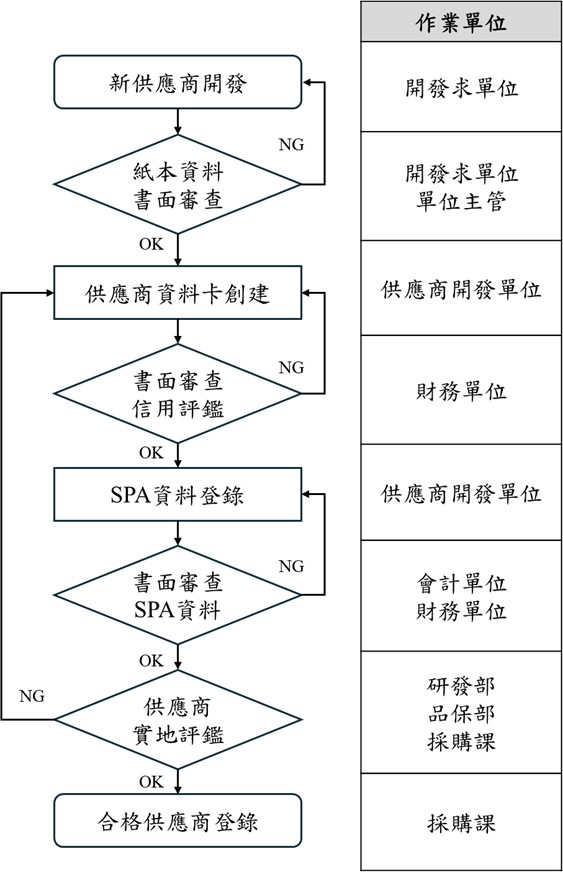 供應商管理政策本公司建立供應商的尋找、審查、評鑑及管理方式,以確保所選定的供應商所提供的產品品質、價格、交期、配合度、服務、產能及環安衛能符合公司的採購要求及價格政策, 特訂定「供應商管理政策」(以下簡稱本政策)。 一、本公司針對供應商提供產品、服務或採購金額之差異制定相應管理措施。 二、本公司建立供應商管理機制以掌握供應商的營運情形,降低供應商營運風險及預防其風險對本公司造成的衝擊。本公司的供應商管理機制如下: 供應商評估作業: